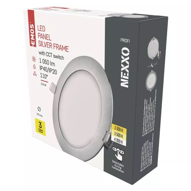 Kulatý podhledový mini LED panel 12,5W NEXXO s možností přednastavit, pomocí přepínače, teplotu chromatičnosti světla na hodnoty 3000K, 3500K nebo 4000K . Instalace do podhledu. Součástí balení je nestmívatelný zdroj pro napájení panelu. Světelné zdroje v tomto panelu nelze měnit!