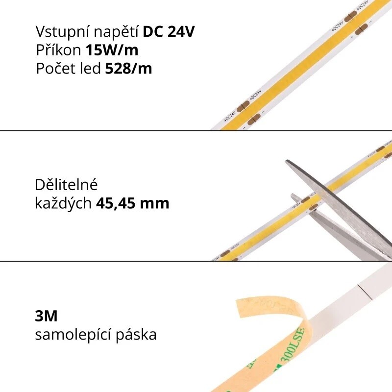 Řada LED pásku COB je speciální řada LED pásků, kde jsou LED čipy zalité vrstvou luminoforu, které způsobuje stejnoměrné svícení LED pásku bez viditelnosti jednotlivých diod. LED pásek COB tedy můžete použít například i u instalací, kde není možné použít dostatečné vhodný profil s mléčným krytem, který standardně světlo z LED pásku může sjednotit do jedné linie. Zalití luminoforem také zvětšuje úhel svitu COB LED pásků na 180°.
