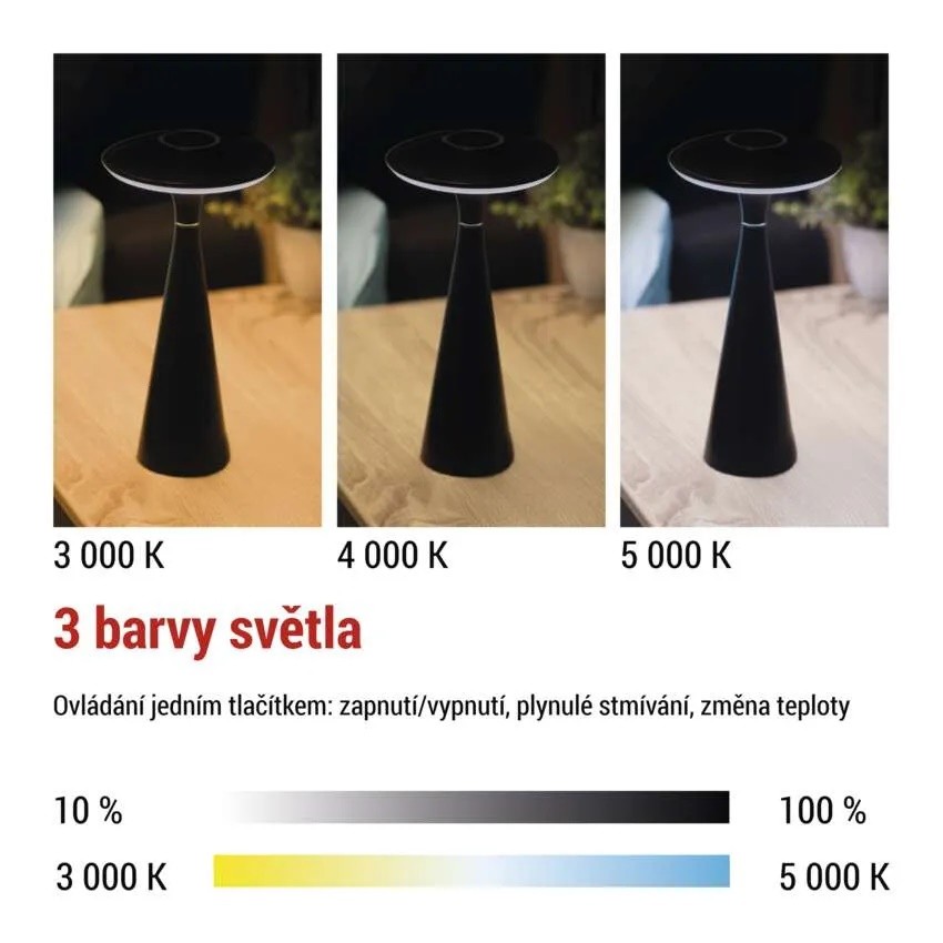 Led stolní lampa, 2,2W stmívatelná, nabíjecí s volbou teploty světla, IP44