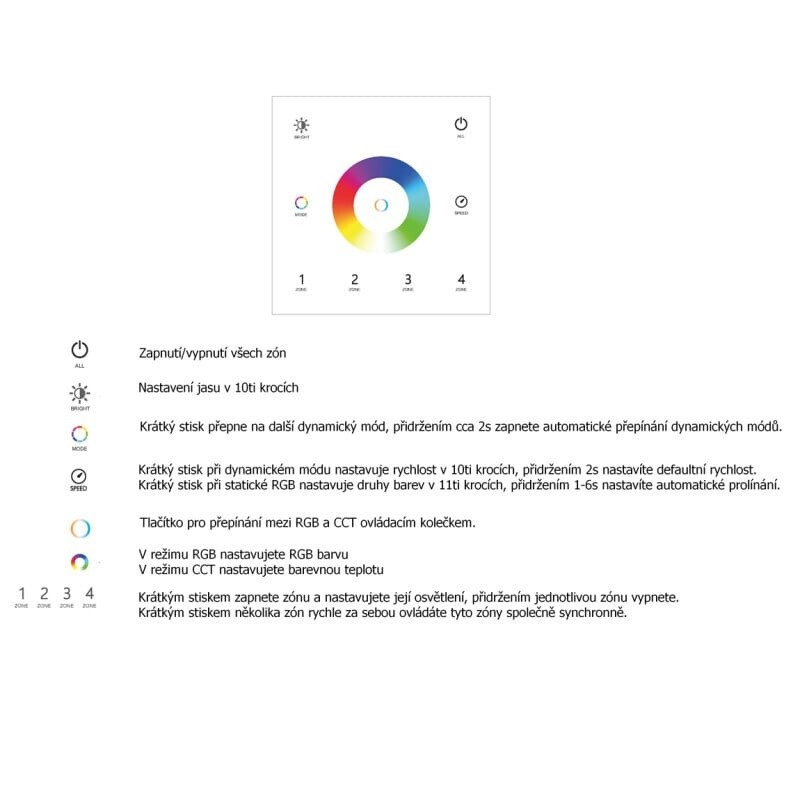 Ovladač pro ovládání: jednobarevné, RGB, RGBW, CCT pásky.