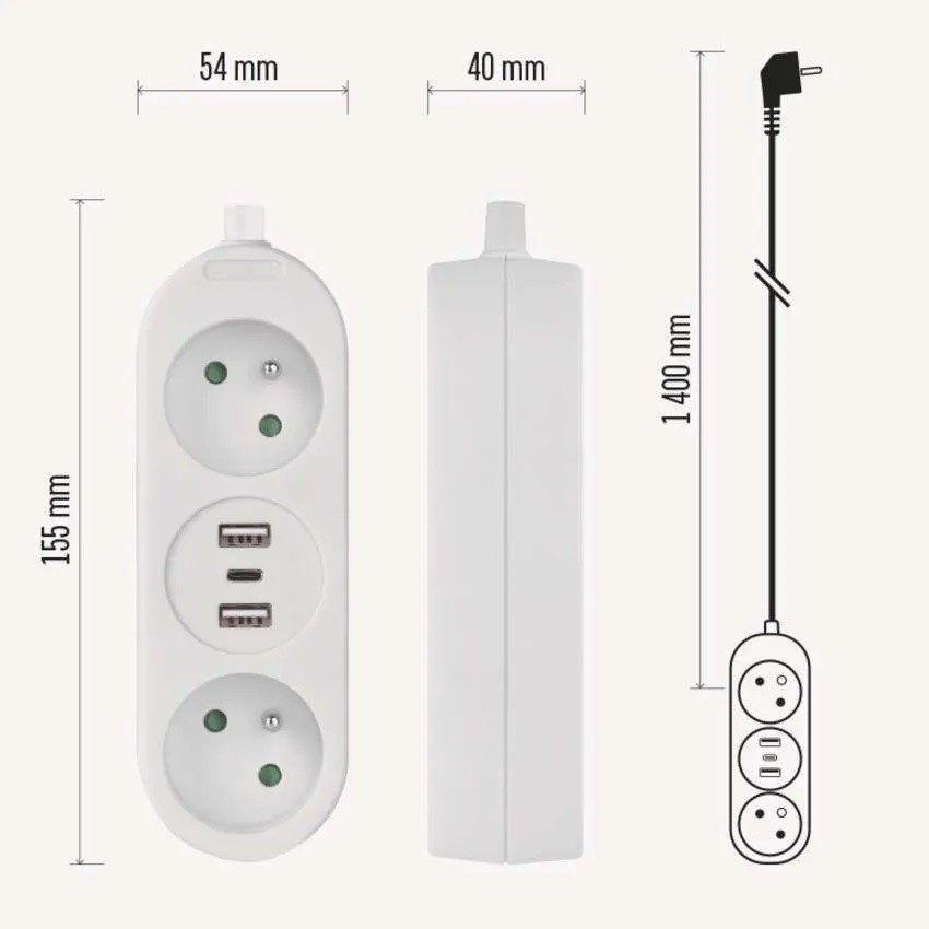 Prodlužovací kabel bílý, 2 zásuvky, 1,4m, 2x USB A a 1x USB C