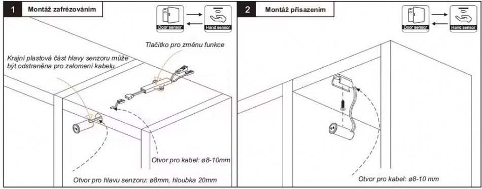 Dva senzor se dvěmi funkcemi, reaguje na překážky do cca 5 - 8cm od senzoru.