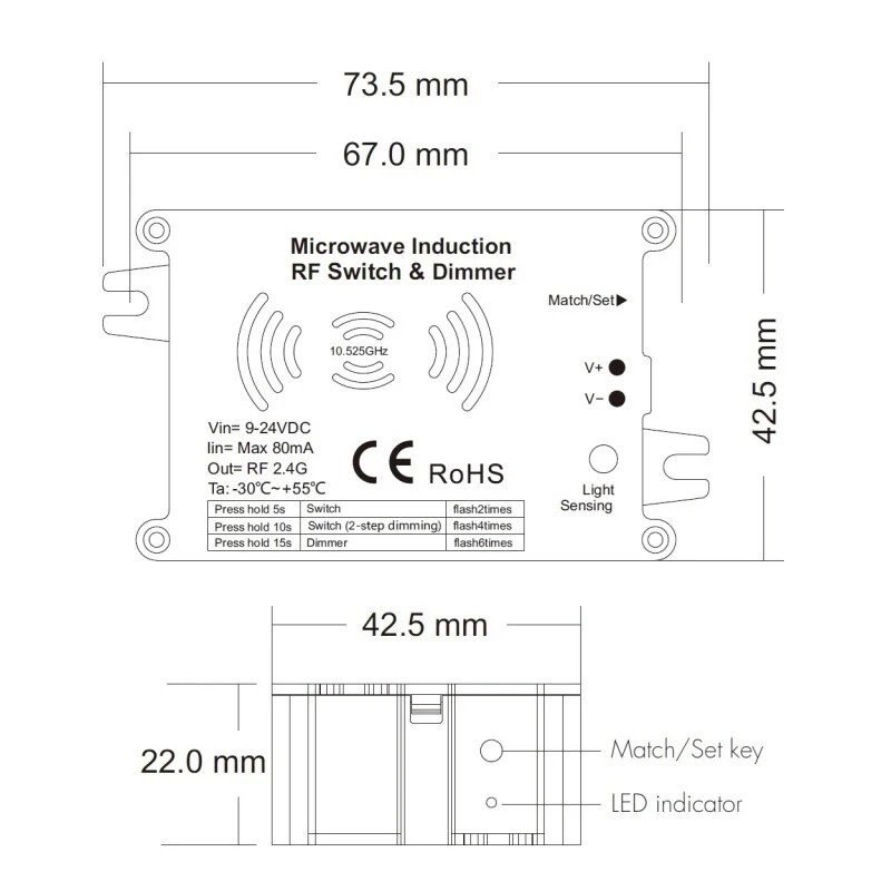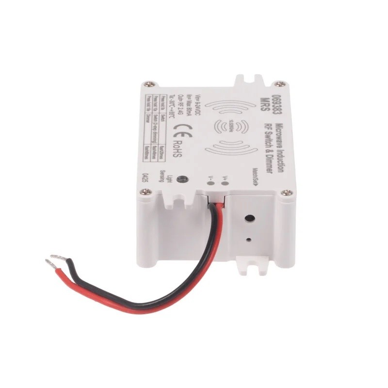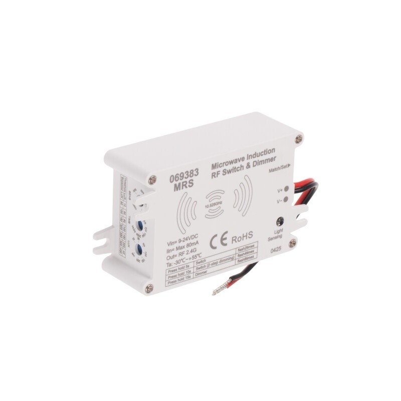 Pohybový senzor dimLED MRS slouží ke spínání přijímačů řady dimLED. Pohybové čidlo lze napárovat tedy například k dimLED přijímačům na LED pásky (jednobarevné, RGB, CCT atd), případně i spínačům a stmívačům na 230V osvětlení. Výhoda čidla je, že můžete umístit čidlo mimo prostor s nainstalovaným osvětlením a osvětlení i nadále ovládat ovladačem.Snímané pole (dosah) čidla je nastavitelné 10-100%, změnu dosahu čidla dle nastavení najdete v galerii, maximální dosah čidla je 20m. Na čidle lze nastavit dobu sepnutí od 10 vteřin do 30 minut a citlivost na světlo (soumrakové nastavení) od 10 do 200 luxů, případně lze citlivost na světlo vypnout.