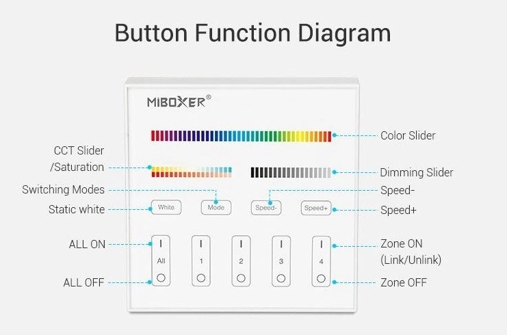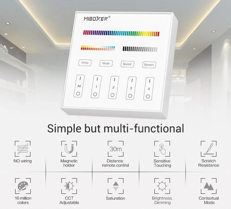 Dotykový panel je nový 4-zónový ovladač v designu skleněné desky a luxusního vzhledu. Díky vysoce přesnému citlivému ovládacímu čipu, který zvyšuje dotekovou citlivost, je dosažena vysoká přesnost ovládání dotykem. Slouží k ovládání RGB a CCT Led světelných zdrojů.